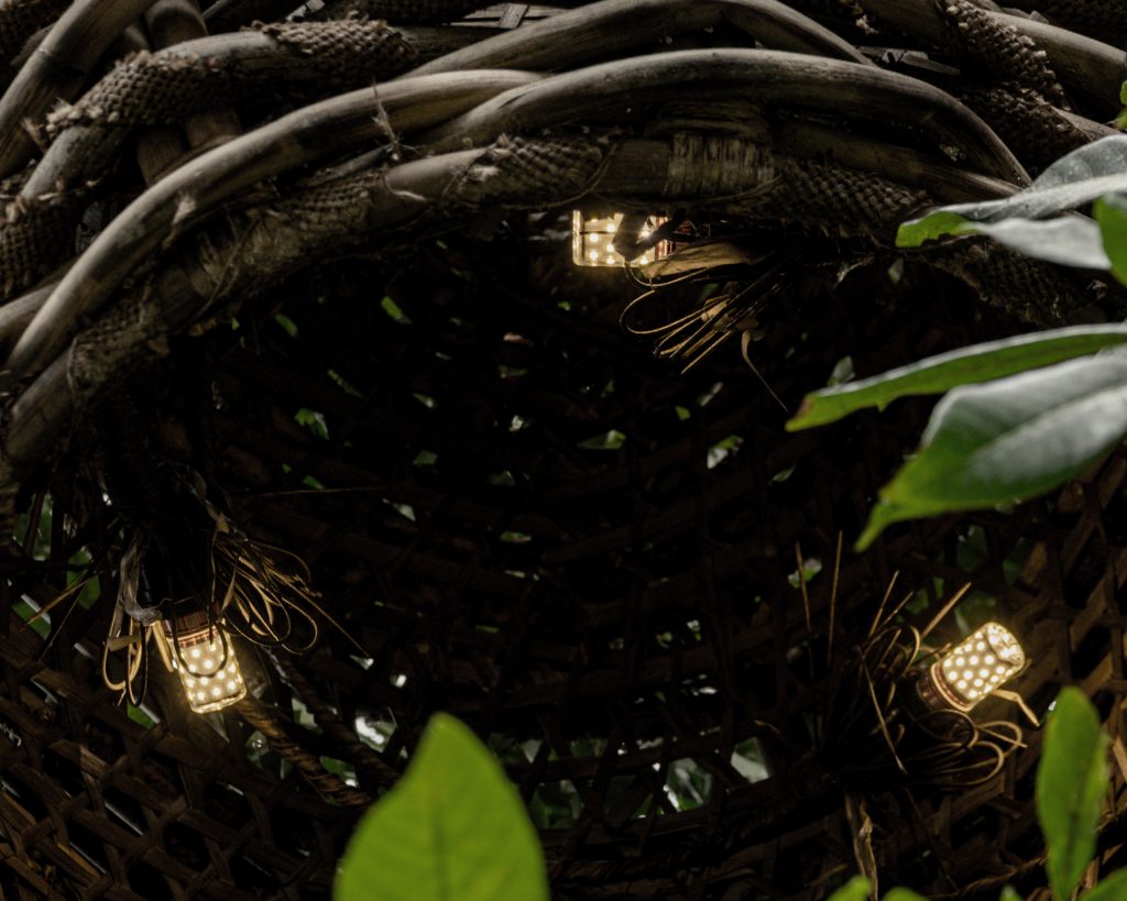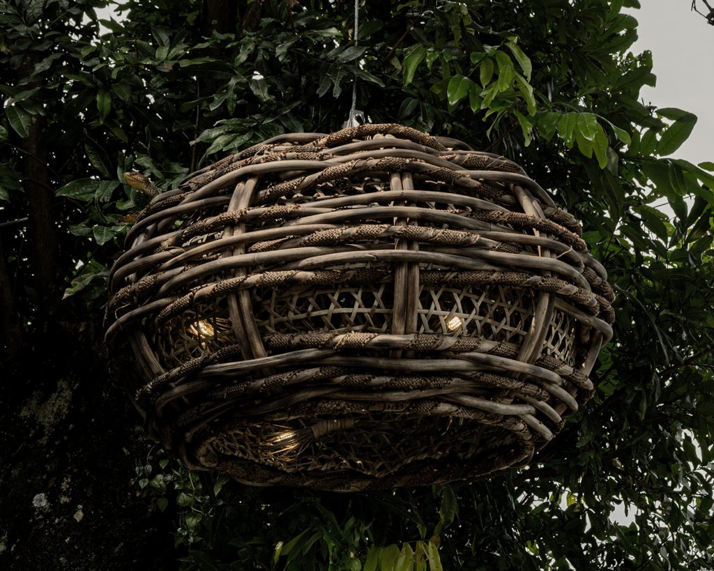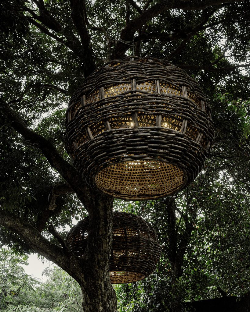 Сферическая форма Baobab, парящая среди деревьев, соединяет органичное плетение с функциональным освещением.
