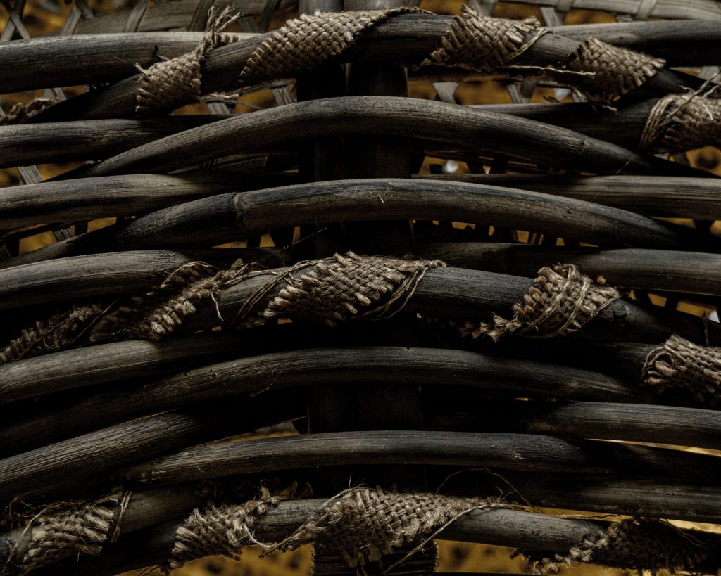 Крупный план натурального ротанга, переплетённого с вручную прошитым мешковым полотном, прославляющего несовершенную красоту ручной работы.